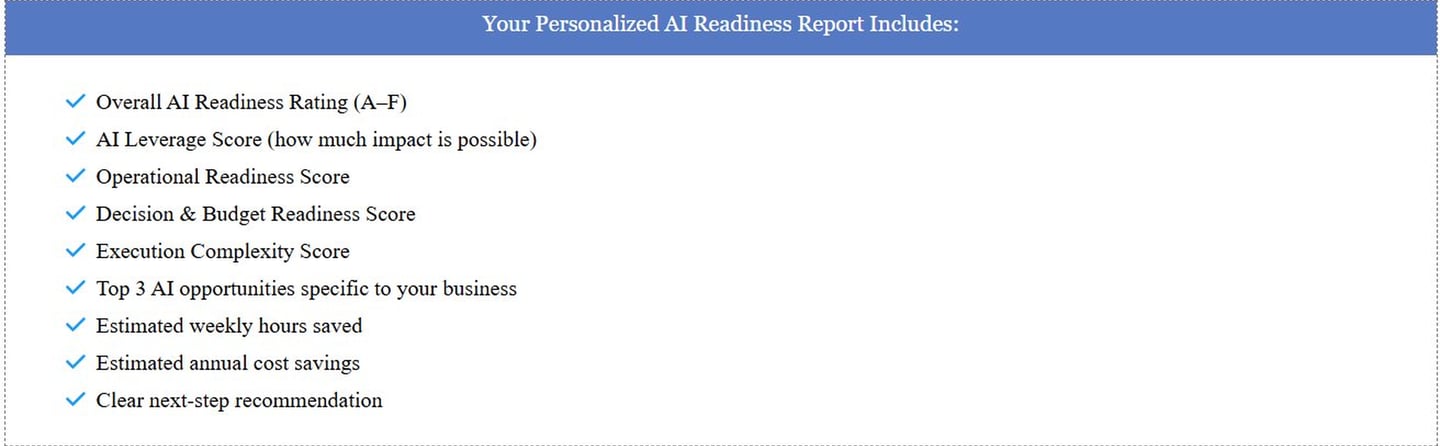 This AI Readiness Assessment shows where AI can actually save time, reduce costs, and unlock growth — and where it can’t.